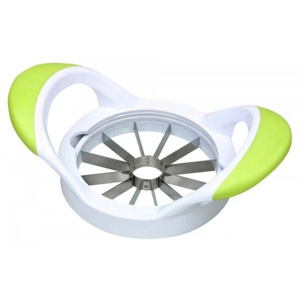 Il est composé d’un cercle de coupe et de deux poignées ergonomiques. Le cercle présente une lame multiple comportant 12 rayons disposés à équidistance, et un petit cercle central qui va servir à évider la pomme de son trognon. Les rayons quant à eux, vont tout simplement découper la pomme en 12 quartier égaux.